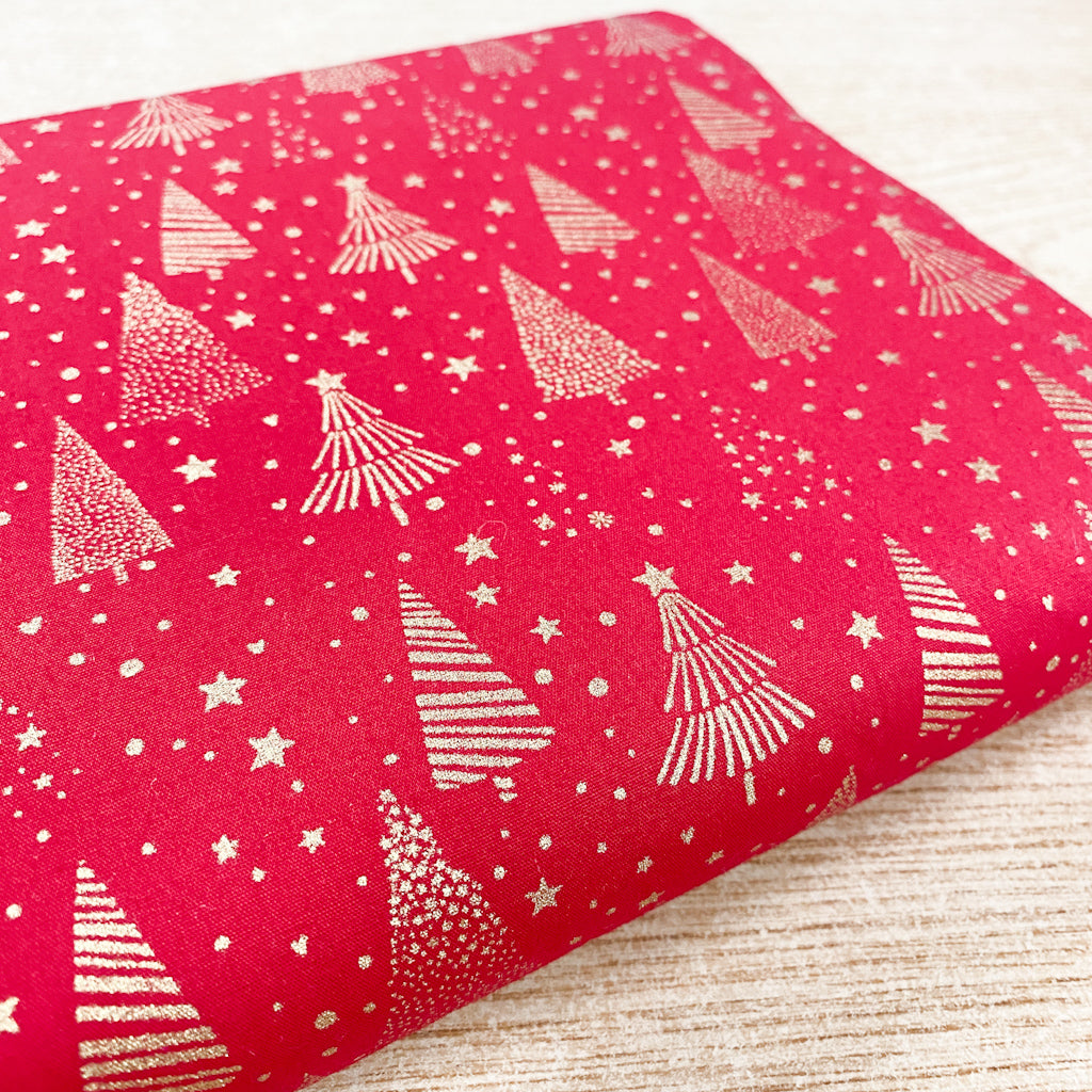 Fondo rojo con diferentes árboles de navidad en color dorado.