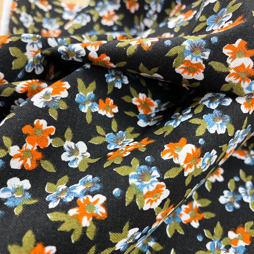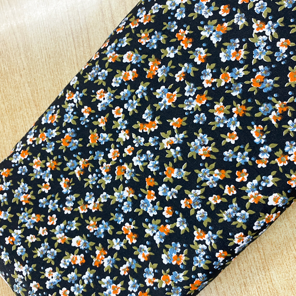 Fondo negro con florecitas pequeñas en azul, naranja y verde.