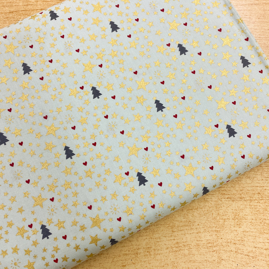 Fondo verde menta con estrellitas en dorado, arbolitos en gris y corazoncitos rojos.