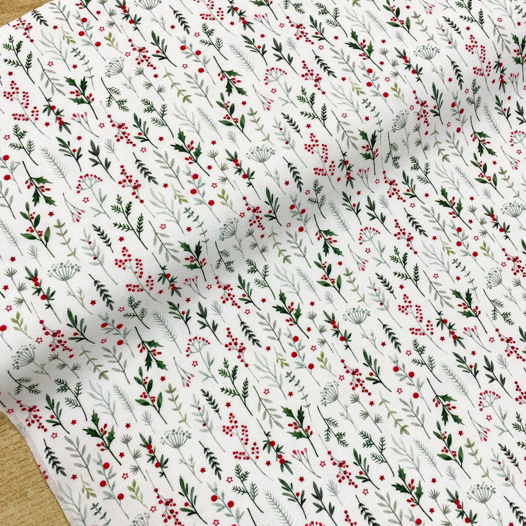 Fondo blanco con un estampado de ramitas en verde y granate.