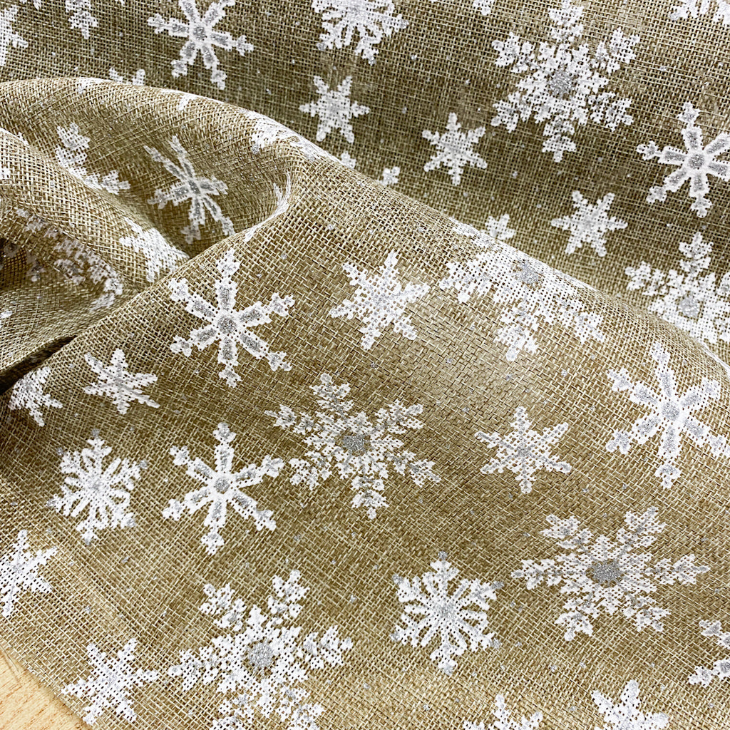 Tela tipo saco con copos de nieve en plateado. Es perfecta para hacer caminos de mesa, decorar regalos…